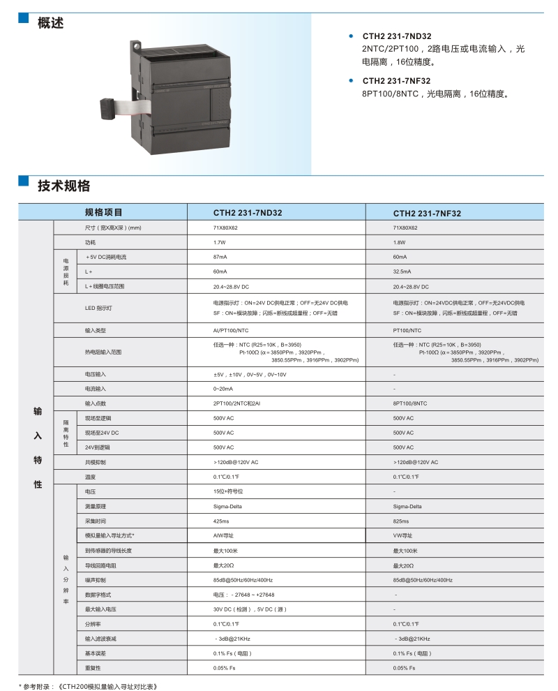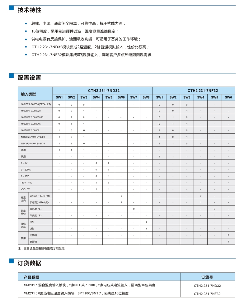 | SM 231:混合溫度輸入模塊,2點NTC或PT100,2點0~20mA電流或±5V,±10V,0~10V,0~5V電壓輸入,隔離型16位精度 | CTH2 231-7ND32 |